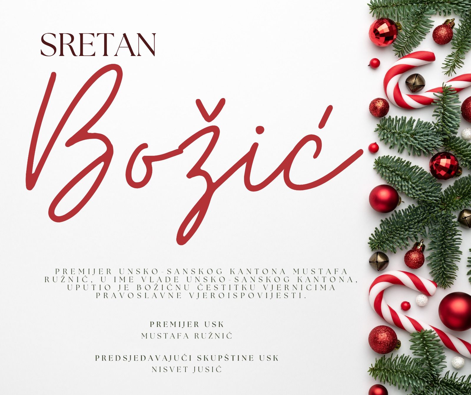 Premijer Unsko-sanskog kantona Mustafa Ružnić , u ime Vlade Unsko-sanskog kantona, uputio je božićnu čestitku vjernicima pravoslavne vjeroispovijesti.