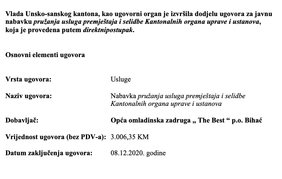 Nabavka pružanja usluga premještaja i selidbe Kantonalnih organa uprave i ustanova