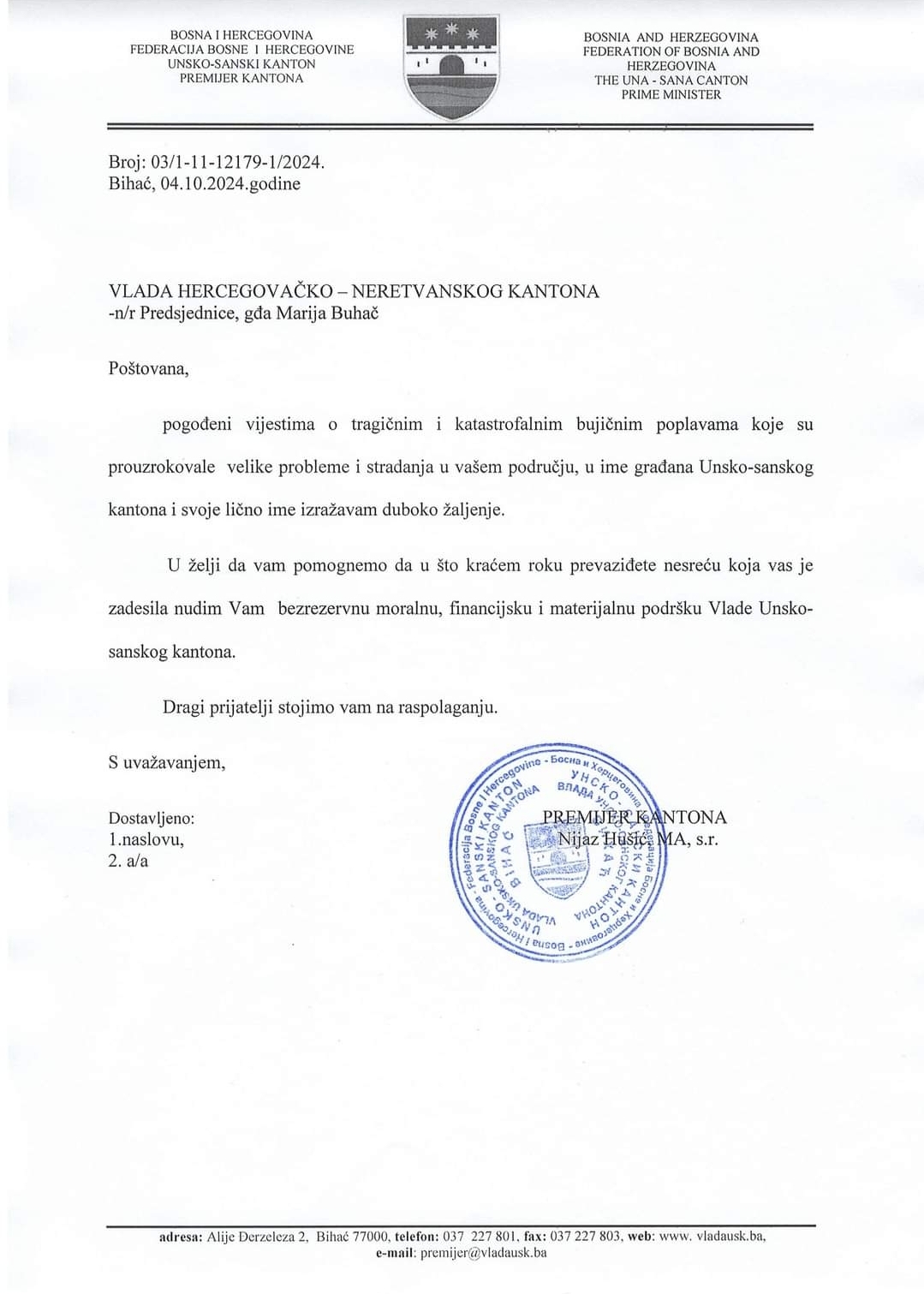 Po nalogu Nijaza Hušića, premijera Unsko-sanskog kantona i komandanta Štaba civilne zaštite, ovaj Kanton je hitno započeo pripremu slanja mehanizacije za ispomoć u saniranju posljedica katastrofalnih poplava u općinama Jablanica i Konjic.