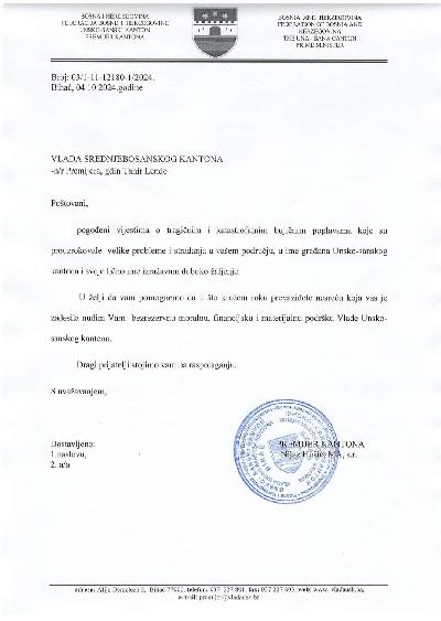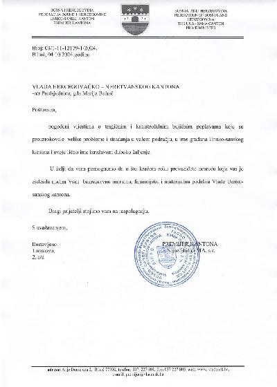Premijer Hušić stavio se na raspolaganje kolegama iz Srednjobosanskog i Herecegovačko- neretvanskog kantona i ponudio pomoć Unsko-sanskog kantona građanima poplavljenih područja.