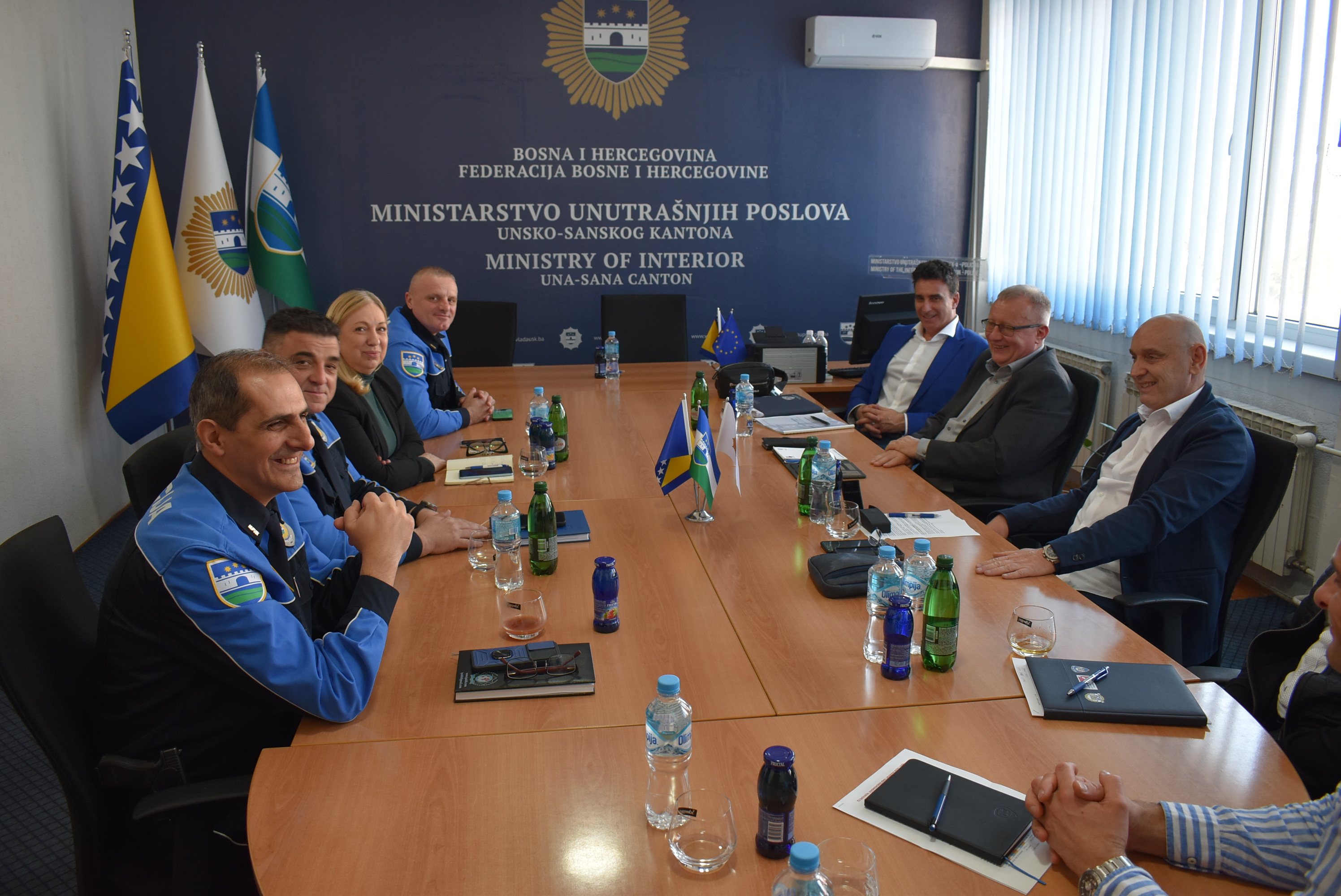 Dana 24.03.2026.godine održan je radni sastanak između predstavnika Uprave policije Ministarstva unutrašnjih poslova Unsko-sanskog kantona, zamjenik direktora Avrudin Muminović, te glavni inspektori Snežana Galić, Mario Velić i Adnan Hasić i predstavnika Policijske uprave Karlovačka, načelnika PU Karlovačka Darko Car i zamjenika načelnika PU Karlovačka Darko Bratić, te voditelja Službe za javni red i sigurnost Jure Pavlinić, voditelja Službe kriminalističke policije Romano Benković, voditelja Službe za granicu Damir Butina. Sastanak je organizovan s ciljem unapređenja međusobne suradnje, razmjene iskustava i jačanje kordinacije u oblasti sigurnosti, posebno u segmentima od zajedničkog interesa kao što su prekogranična saradnja, borba protiv kriminala i upravljanje migracijama. Poseban akcent stavljen je na nastavak uspješne suradnje i razvoj partnerskih odnosa između dvije policijske agencije.