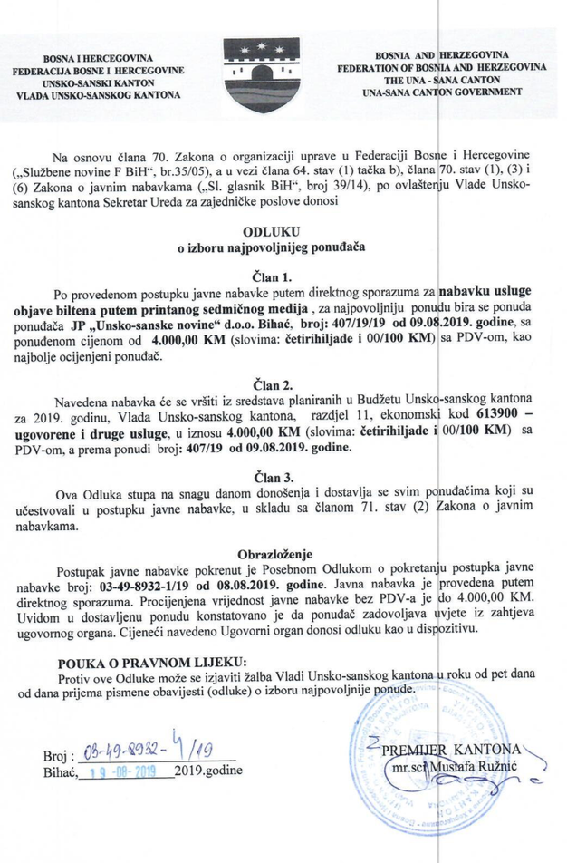 Preuzmi dokument: Odluka o izboru najpovoljnijeg ponuđača