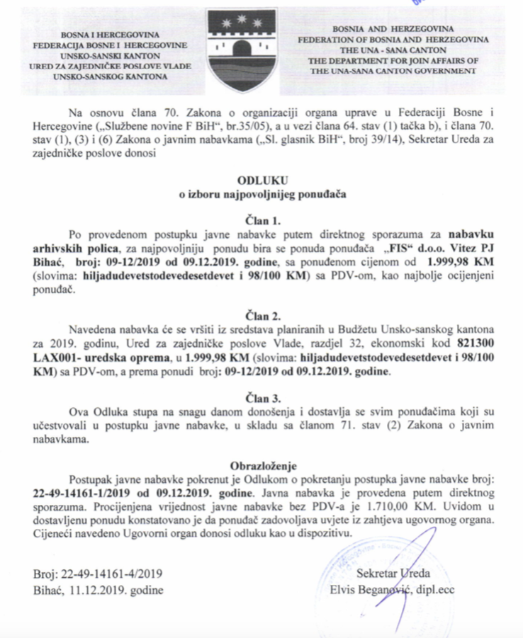Preuzmi dokument: Odluka o izboru najpovoljnijeg ponuđača