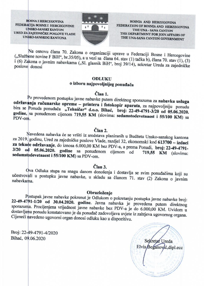 Preuzmi dokument: Odluka o izboru najpovoljnijeg ponuđača