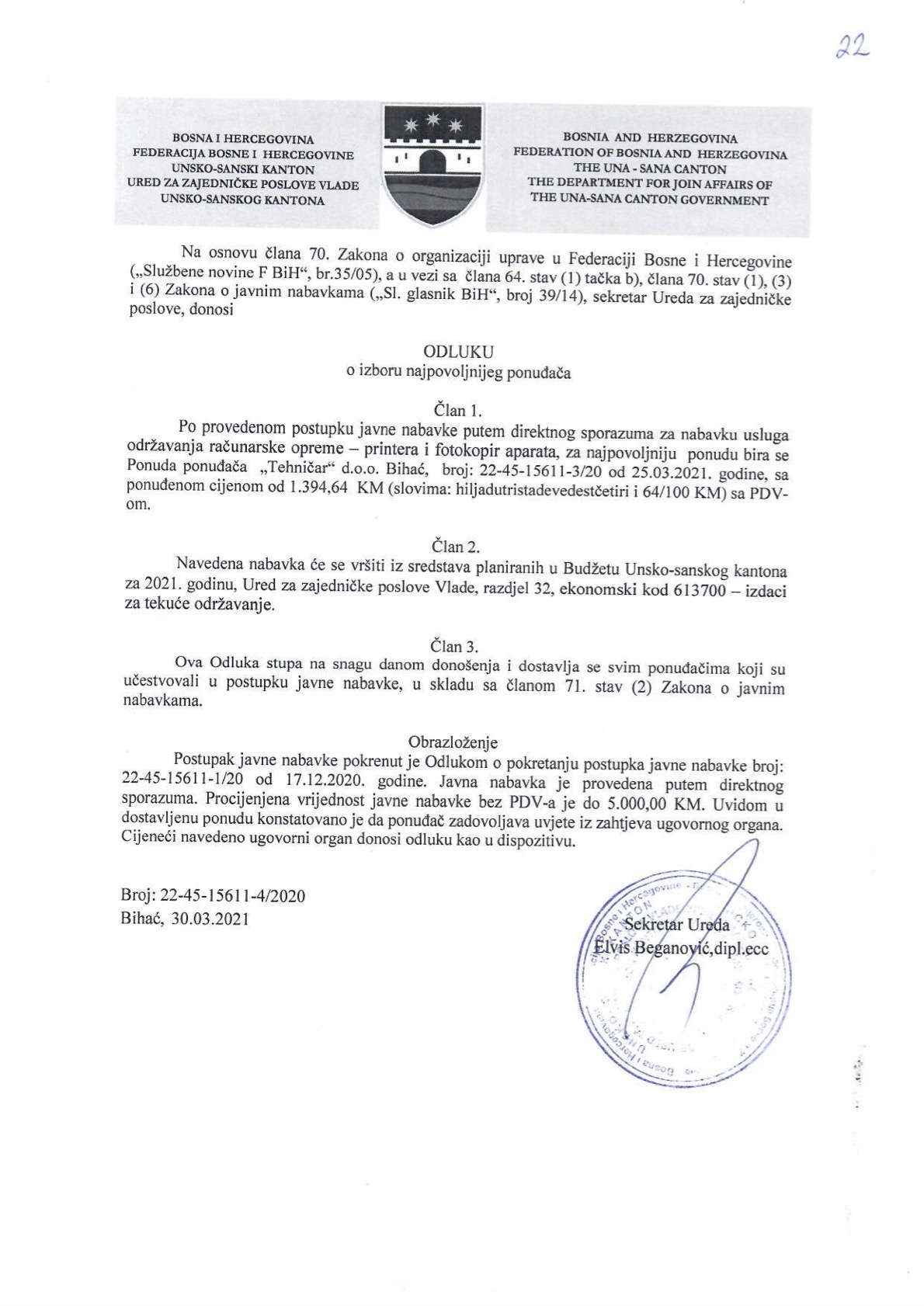 Preuzmi dokument: Odluka o izboru najpovoljnijeg ponuđača