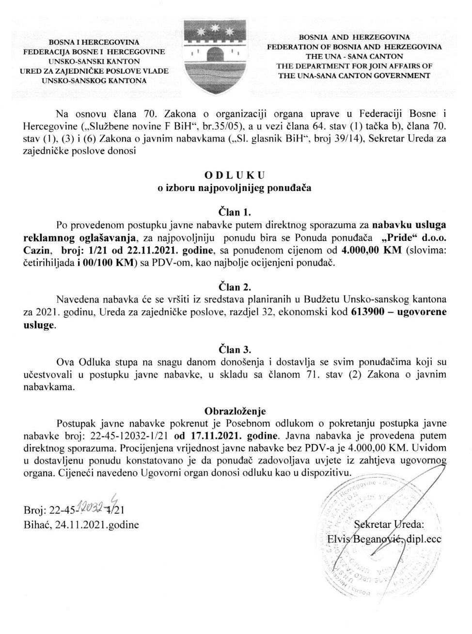 Preuzmi dokument: Odluka o izboru najpovoljnijeg ponuđača