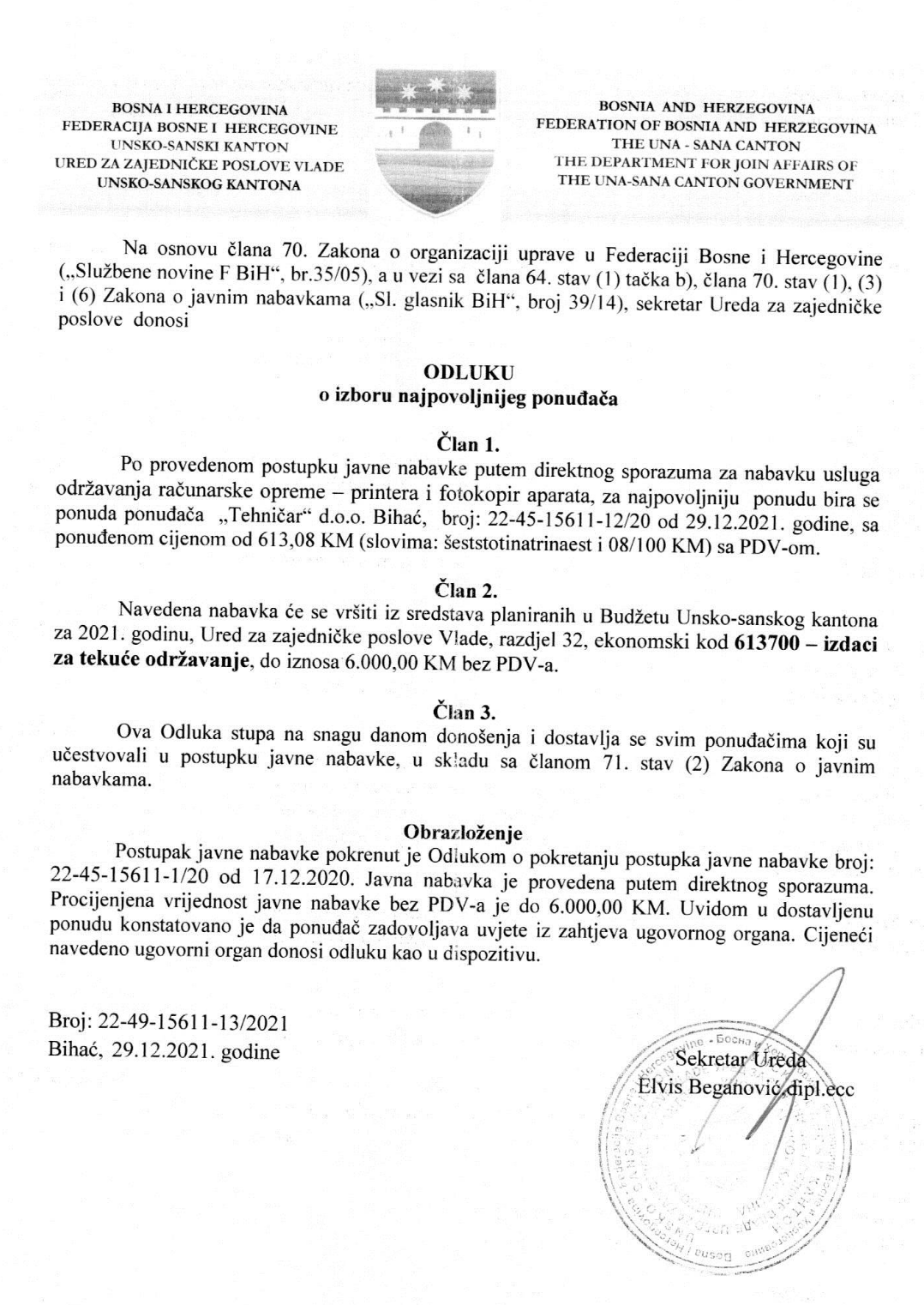 Preuzmi dokument: Odluka o izboru najpovoljnijeg ponuđača