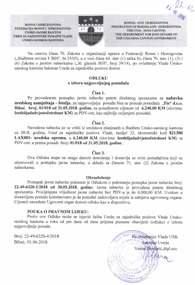 Preuzmi dokument: Odluka o izboru najpovoljnijeg ponuđača