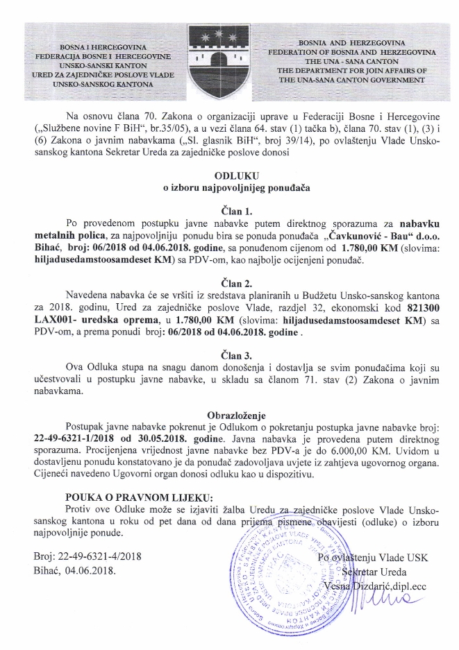 Preuzmi dokument: Odluka o izboru najpovoljnijeg ponuđača
