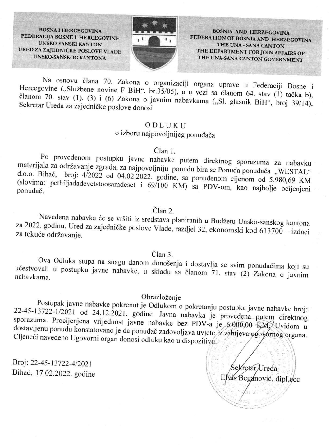 Preuzmi dokument: Odluka o izboru najpovoljnijeg ponuđača