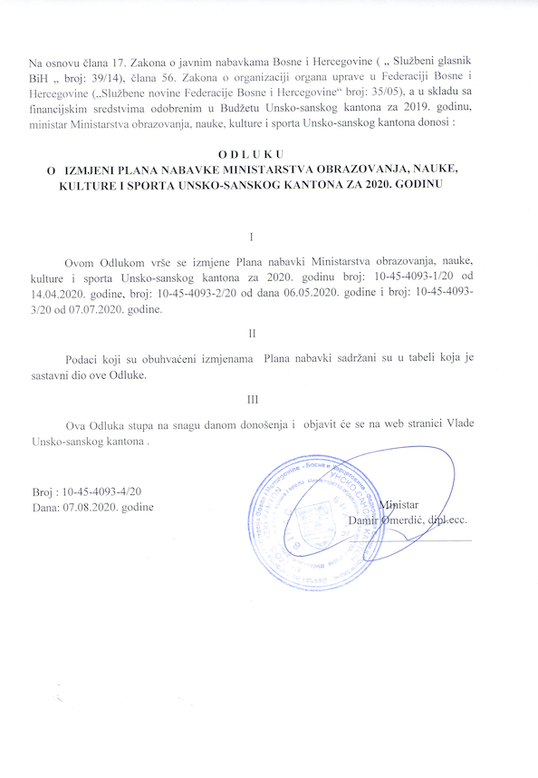 Odluka o izmjeni Plana javnih nabavki za 2020. godinu.