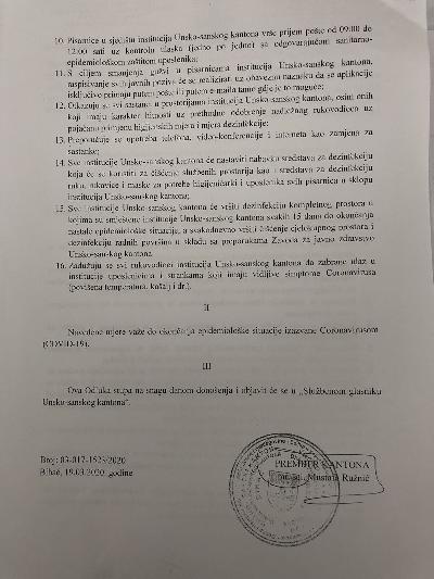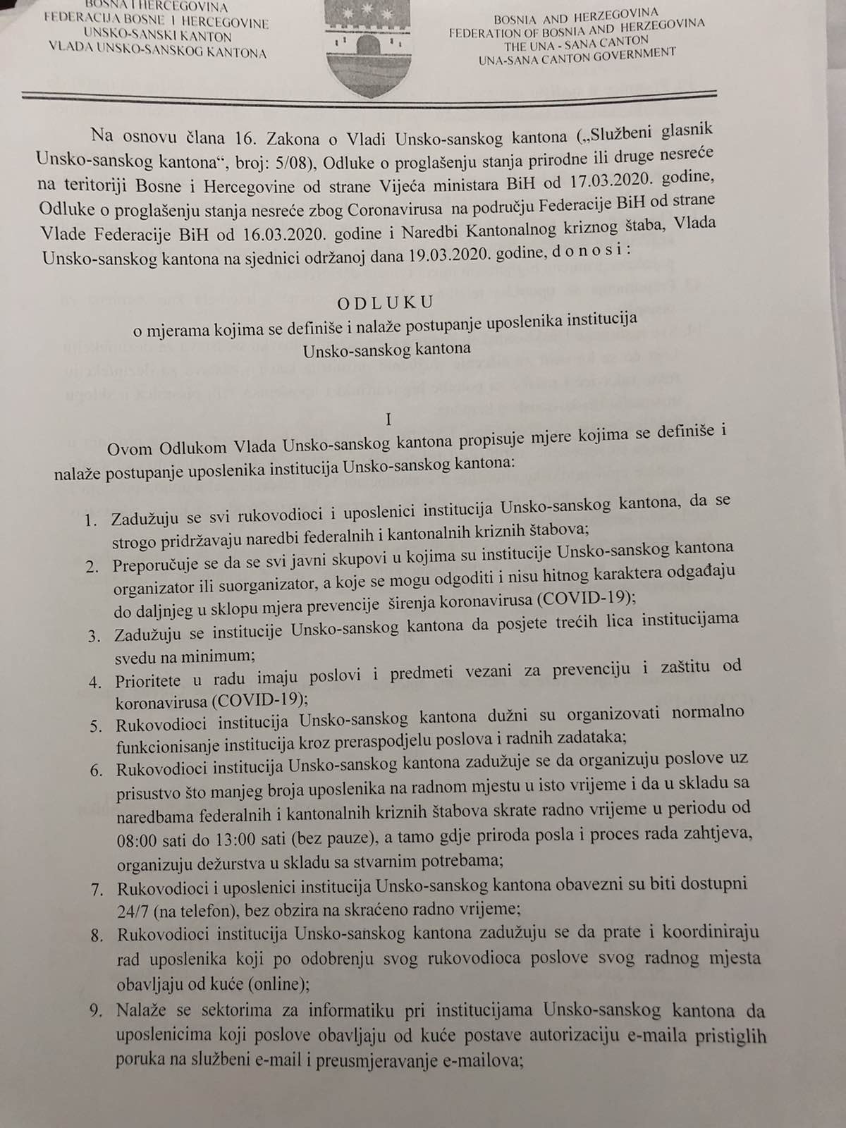 Odluka o mjerama kojom se definiše i nalaže postupanje uposlenika institucija Unsko - sanskog kantona