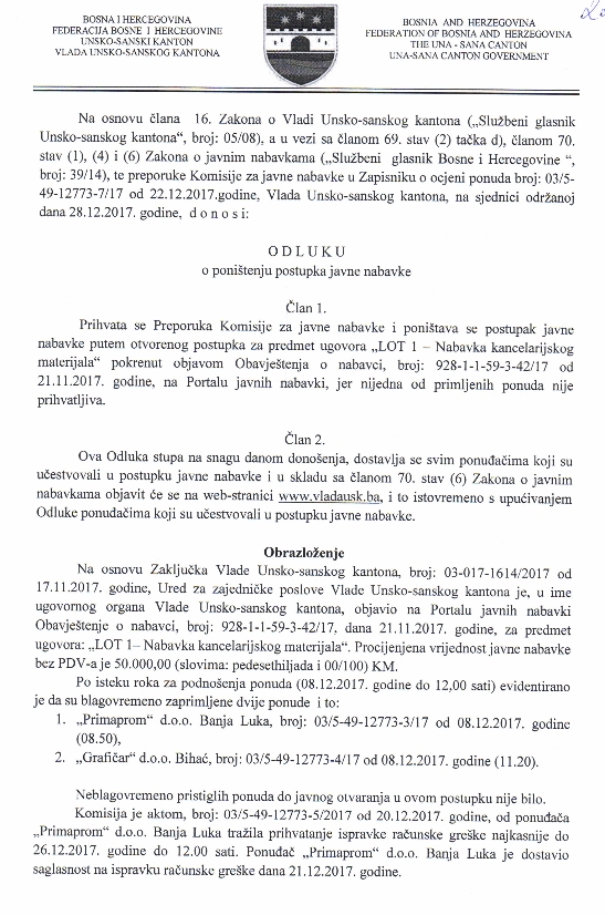 Preuzmi dokument: Odluka o poništenju postupka javne nabavke