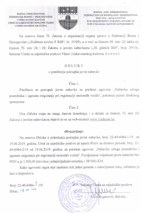 Preuzmi dokument: Odluka o poništenju postupka javne nabavke