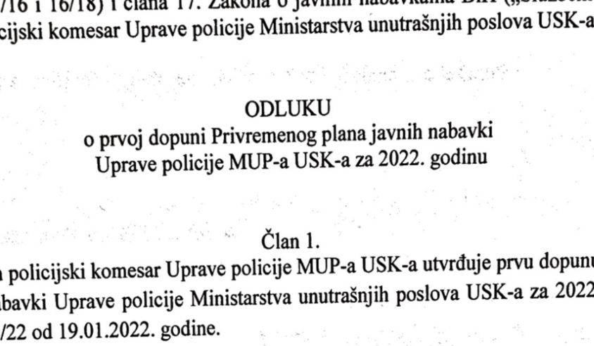 Odluka o prvoj dopuni Privremenog plana javnih nabavki Uprave policije MUP-a USK za 2022. godinu (PREUZMI ODLUKU)