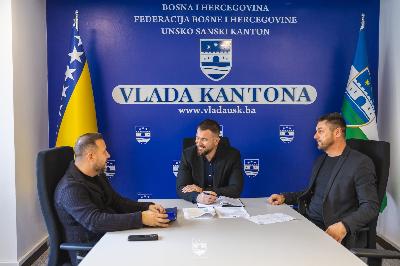 Edvin Odobašić, ministar za građenje, prostorno uređenje i zaštitu okoliša u Vladi Unsko-sanskog kantona i Izudin Hilić, savjetnik premijera USK razgovarali su danas sa Sabahudinom Bajramovićem, direktorom firme "SabAz Group" iz Velike Kladuše.