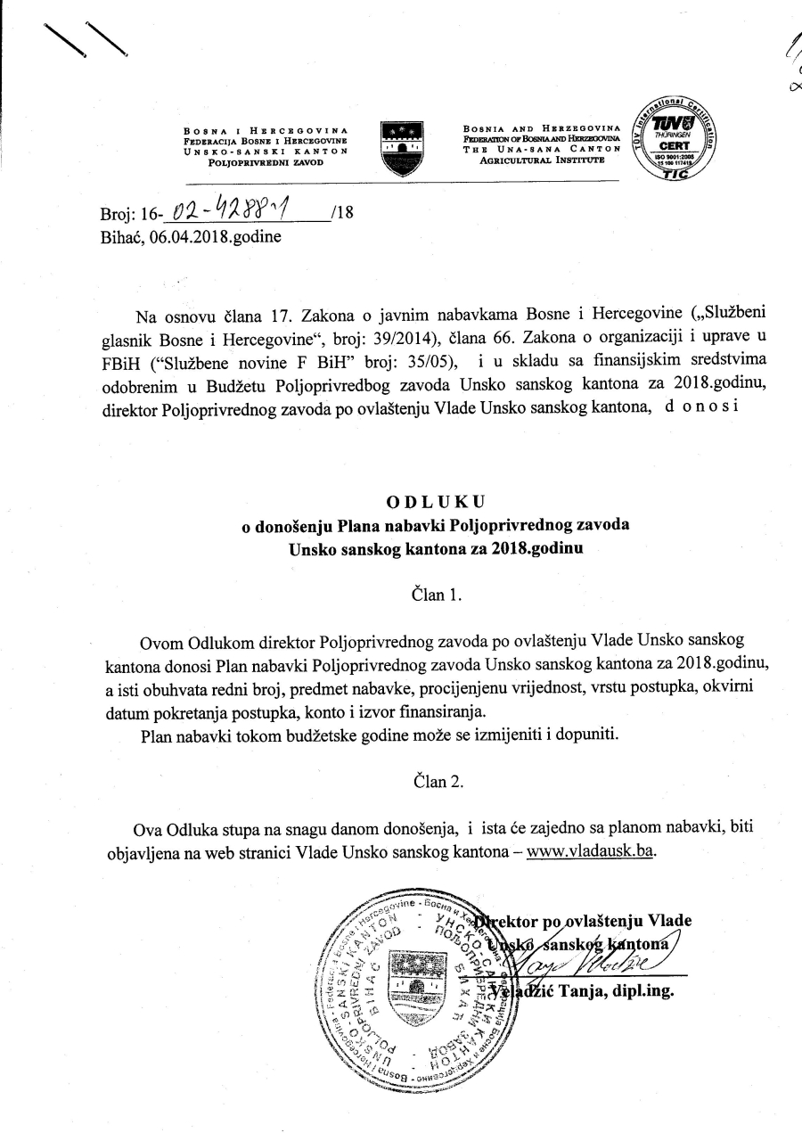 Odluka o usvajanju izmjena i dopuna Plana integriteta u Poljoprivrednom zavodu USK-a (26.03.2026) Odluka o izboru najpovoljnijeg ponuđača - 07.05.2019. (13.05.2019) Odluka o izboru najpovoljnijeg ponuđača (26.09.2018) Odluka o poništenju postupka javne nabavke (15.08.2018) ODLUKA o izboru najpovoljnijeg ponuđača (09.10.2017.godine) (23.10.2017)