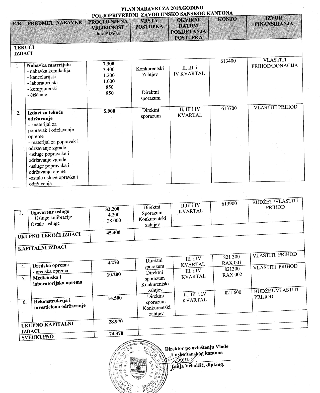 Odluka o izboru najpovoljnijeg ponuđača (15.04.2026) Odluka o zaključenju direktnog sporazuma (14.04.2026) Odluka o zaključivanju direktnog sporazuma (30.12.2025) Odluka o zaključivanju direktnog sporazuma (17.12.2025) Odluka o izboru najpovoljnijeg ponuđača (16.12.2025) Odluka o zaključivanju direktnog sporazuma (21.11.2025) Odluka o zaključivanju direktnog sporazuma (10.11.2025) Odluka o zaključivanju direktnog sporazuma (10.11.2025) Odluka o zaključenju direktnog sporazuma (09.09.2025) Odluka o zaključivanja direktnog sporazuma (03.09.2025) Odluka o zaključenju direktnog sporazuma (30.07.2025) Odluka o zaključenju direktnog sporazuma (28.07.2025) Odluka o zaključenju direktnog sporazuma (28.07.2025) Odluka o zaključenju direktnog sporazuma (28.07.2025) Odluka o zaključenju direktnog sporazuma (08.07.2025) Odluka o zaključenju direktnog sporazuma (01.07.2025) Odluka o zaključivanju direktnog sporazuma - Toneri (19.06.2025) Odluka o zaključivanja direktnog sporazuma (18.06.2025) Odluka o zaključivanju direktnog sporazuma (18.06.2025) Odluka o zaključenju direktnog sporazuma - Red Computers (04.06.2025) Odluka o zaključenju direktnog sporazuma (04.06.2025) Odluka o zaključenju direktnog sporazuma (14.04.2025) Odluka o poništenju postupka javne nabavke (11.04.2025) Odluka o zaključenju direktnog sporazuma (28.03.2025) Odluka o zaključenju direktnog sporazuma (06.03.2025) Odluka o zaključenju direktnog sporazuma sa ponuđačem JP Unsko-sanske novine d.o.o. (04.03.2025) Odluka o zaključenju direktnog sporazuma sa ponuđačem d.o.o. TQM -Institut za kvalitet, standardizaciju i ekologiju (04.03.2025) Odluka o izboru trećerangiranog ponuđača (18.12.2024) Odluka o izboru najpovoljnijeg ponuđača (16.12.2024) Odluka o izboru najpovoljnijeg ponuđača (28.11.2024) Odluka o zaključenju direktnog sporazuma (20.11.2024) Odluka o izboru drugorangiranog ponuđača (14.11.2024) Odluka o izboru najpovoljnijeg ponuđača (25.10.2024) Odluka o zaključivanju direktnog sporazuma (03.10.2024) Odluka o izboru najpovoljnijeg ponuđača (11.09.2024) Odluka o izboru najpovoljnijeg ponuđača (05.09.2024) Odluka o zaključenju direktnog sporazuma (01.07.2024) Odluka o zaključivanju direktnog sporazuma (20.06.2024) Odluka o zaključenju direktnog sporazuma (14.06.2024) Odluka o zaključenju direktnog sporazuma (12.06.2024) Odluka o zaključenju direktnog sporazuma (05.06.2024) Odluka o poništenju postupka javne nabavke (28.05.2024) Odluka o izboru najpovoljnijeg ponuđača (15.05.2024) Odluka o poništenju postupka javne nabavke (13.05.2024) Odluka o izboru najpovoljnijeg ponuđača (14.05.2024) Odluka o poništenju postupka javne nabavke (18.04.2024) Odluka o zaključivanju direktnog sporazuma - Asa Central osiguranje (02.04.2024) Odluka o zaključivanju direktnog sporazuma - JP Unsko-sanske novine (02.04.2024) Odluka o zaključivanju direktnog sporazuma - JP Radio-Televizija USK-a (02.04.2024) Odluka o zaključivanje direktnog sporazuma 2024. (09.01.2024) Odluka o zaključenju direktnog sporazuma 26.12.2023. (26.12.2023) Odluka o zaključenju direktnog sporazuma 14.12.2023. (20.12.2023) Odluka o zaključivanju direktnog sporazuma 29.11.2023. (29.11.2023) Odluka o zaključivanju direktnog sporazuma, 13.11.2023. (15.11.2023) Odluka o zaključenju direktnog-Euroing - 25.10.2023. (02.11.2023) Odluka o zaključivanju direktno sporazuma 24.10.2023. (24.10.2023) Odluka o zaključivanju direktno sporazuma 11.10.2023. (12.10.2023) Odluka o izboru najpovoljnijeg ponuđača 12.10.2023. (12.10.2023) Odluka o poništenju postupka javne nabavke 10.10.2023. (11.10.2023) Odluka o zakljucivanju direktnog sporazuma 21.09.2023. (21.09.2023) Odluka o zakljucivanju direktnog sporazuma 2023 (14.09.2023) Odluka o zaključenju direktnog sporazuma-kancelarijska i kompjuterska oprema 2023. (14.09.2023) Odluka o izboru najpovoljnijeg ponuđača - 13.09.2023. (13.09.2023) Odluka o zaključenju direktnog sporazuma-nabavka tonera (06.09.2023) Odluka o zaključenju direktnog sporazuma - kancelarijske stolice 2023. (06.09.2023) Odluka o izboru najpovoljnijeg ponudjaca 03.08.2023. (04.08.2023) Odluka o zaključenju direktnog sporazuma 25.07.2023. (25.07.2023) Odluka o zaključivanju direktnog sporazuma 07.06.2023. (07.06.2023) Odluka o izboru najpovoljnijeg ponuÄ‘ača - 13.12.2022. (19.12.2022) Odluka o izboru najpovoljnijeg ponuÄ‘ača - 09.12.2022. (12.12.2022) Odluka o izboru najpovoljnijeg ponuÄ‘ača - 22.11.2022. (3) (27.11.2022) Odluka o izboru najpovoljnijeg ponuÄ‘ača - 22.11.2022. (2) (27.11.2022) Odluka o izboru najpovoljnijeg ponuÄ‘ača - 22.11.2022. (27.11.2022) Odluka o poniÅ¡tenju postupka javne nabavke - 22.11.2022. (25.11.2022) Odluka o izboru najpovoljnijeg ponuÄ‘ača - 14.11.2022. (16.11.2022) Odluka o izboru najpovoljnijeg ponuÄ‘ača (direktni sporazum) - 07.11.2022. (09.11.2022) Bitni elementi ugovora - 12.10.2022. (12.10.2022) Odluka o ponistenju postupka javne nabavke 11.10.2022. (11.10.2022) Odluka o izboru najpovoljnijeg ponudjaca - 28.09.2022. - 2 (29.09.2022) Odluka o izboru najpovoljnijeg ponudjaca - 28.09.2022. (29.09.2022) Odluka o poniÅ¡tenju postupka javne nabavke (12.09.2022) Odluka o izboru najpovoljnijeg ponuÄ‘ača - 2022. (07.09.2022) Odluka o izboru najpovoljnijeg ponudjaca - 2022. (31.08.2022) Odluka o izboru najpovoljnijeg ponuÄ‘ača - 2022. (31.08.2022) Odluka o izboru najpovoljnijeg ponudjaca - TUV Adria.pdf (13.07.2022) Bitni elementi ugovora 10.06.2022. (10.06.2022) Odluka o izboru najpovoljnijeg ponudjaca - 31.05.2022. (02.06.2022) Odluka o izboru najpovoljnijeg ponudjaca 2022 - Rez. dijelovi (31.05.2022) Odluka o izboru najpovoljnijeg ponudjaca 2022 - Laboratorijska oprema (31.05.2022) Odluka o izboru najpovoljnijeg ponudjaca 2022 - Kalibracija (31.05.2022) Odluka o izboru najpovoljnijeg ponudjaca - 12.04.2022. (21.04.2022) Realizacija ugovora - 31.03.2022. (04.04.2022) Odluka o izboru ponuÄ‘ača 2022. (30.03.2022) Plan javnih nabav