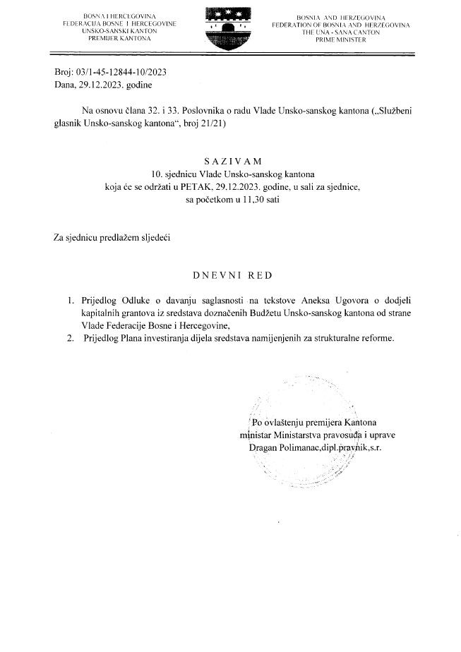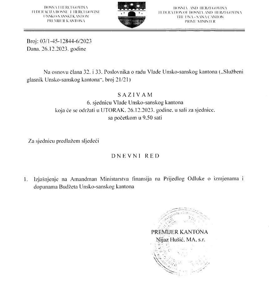 Na osnovu Zaključka Skupštine Unsko-sanskog kantona (broj: 01/1-2-45-607/25 ...