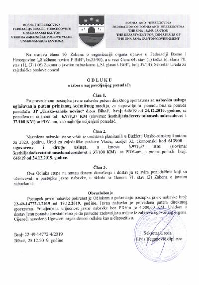 Na osnovu Zaključka Skupštine Unsko-sanskog kantona (broj: 01/1-2-45-607/25 ...